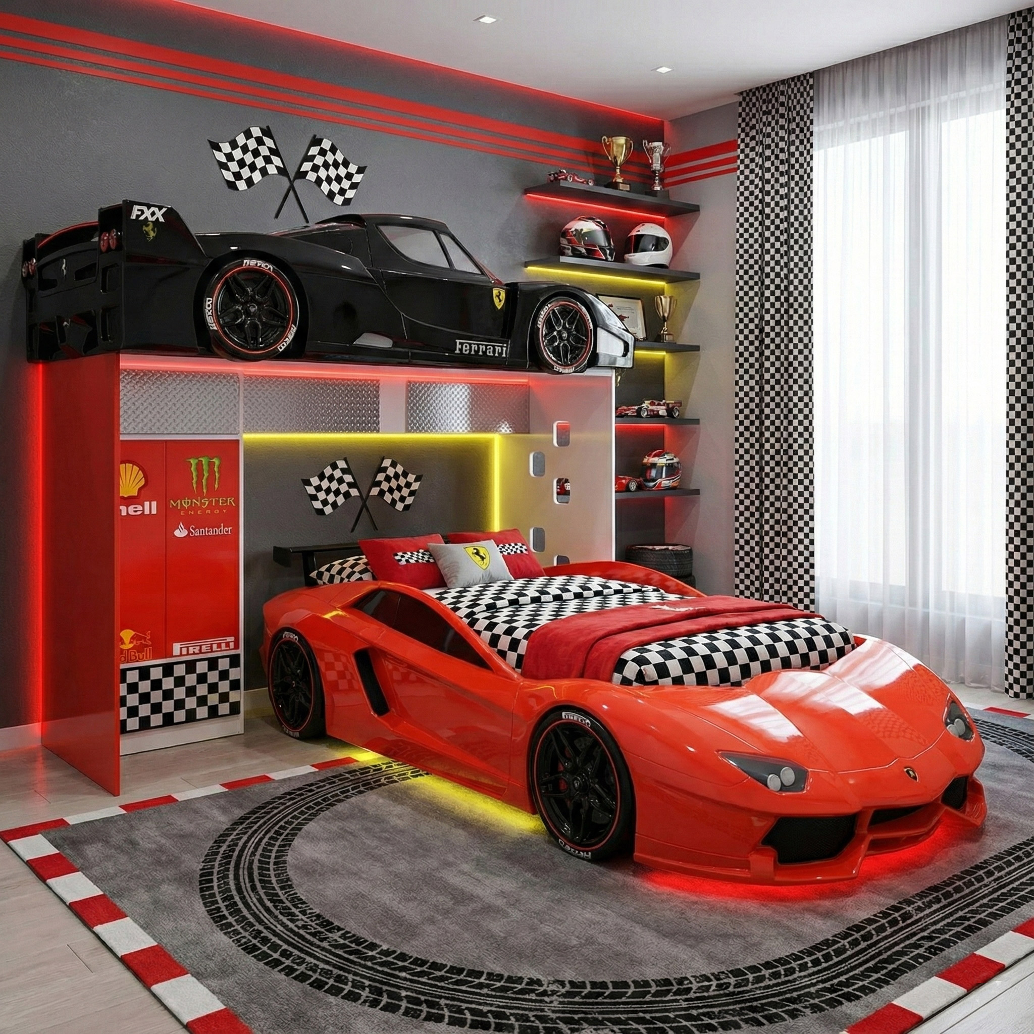 No se necesitan muchos metros para que tu peque tenga su rincón favorito… ¡seguro no querrá salir de su habitación! Esta cama en forma de garage se puede personalizar con su nombre, colores y tema preferido, y ofrece la opción de dormir o jugar en la parte superior.