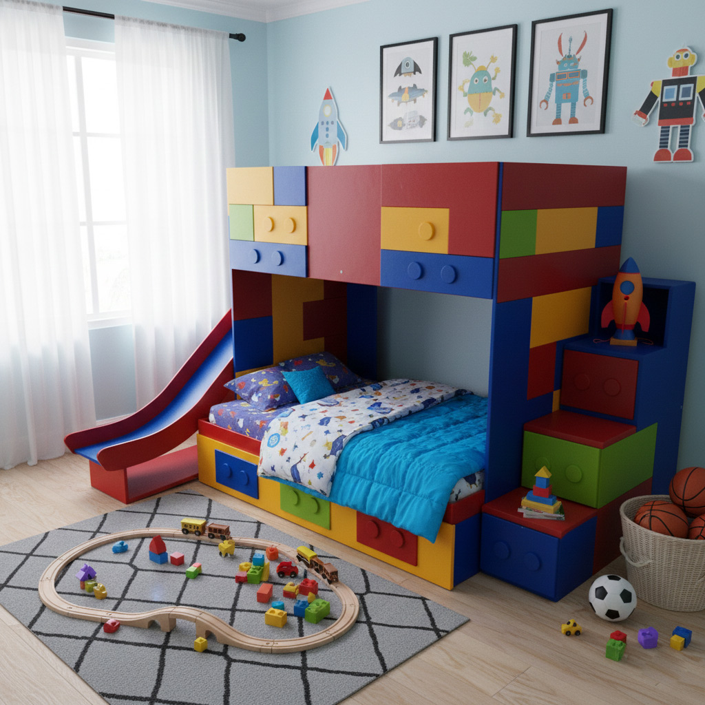¡La litera más divertida para los Peques! Modelo con tres camas fabricada con hojas de MDF, y pino tiene cajones con cubos tipo Lego e incluye escalera con huella.