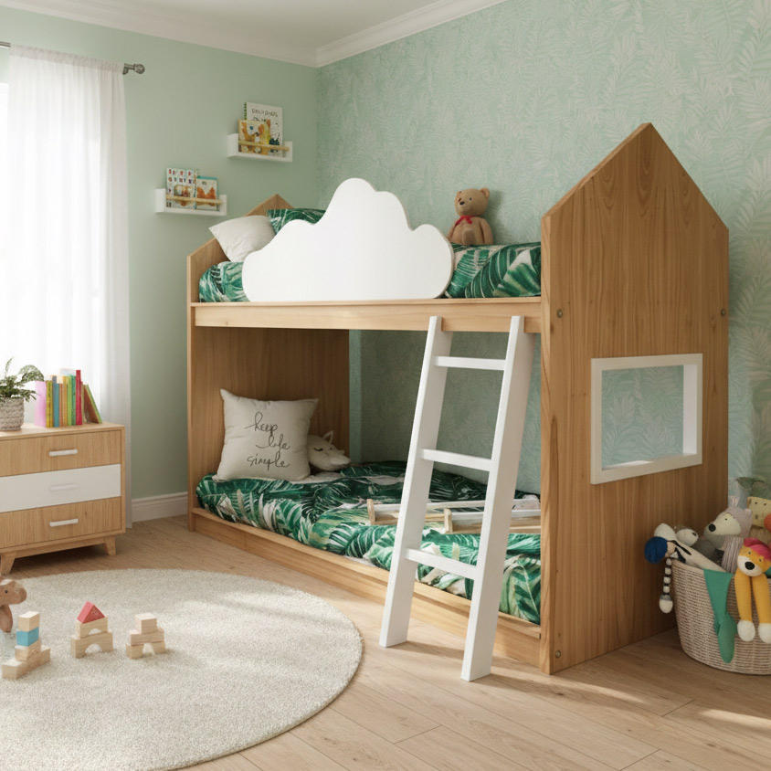 Litera con doble cama y barandal diseño nube.