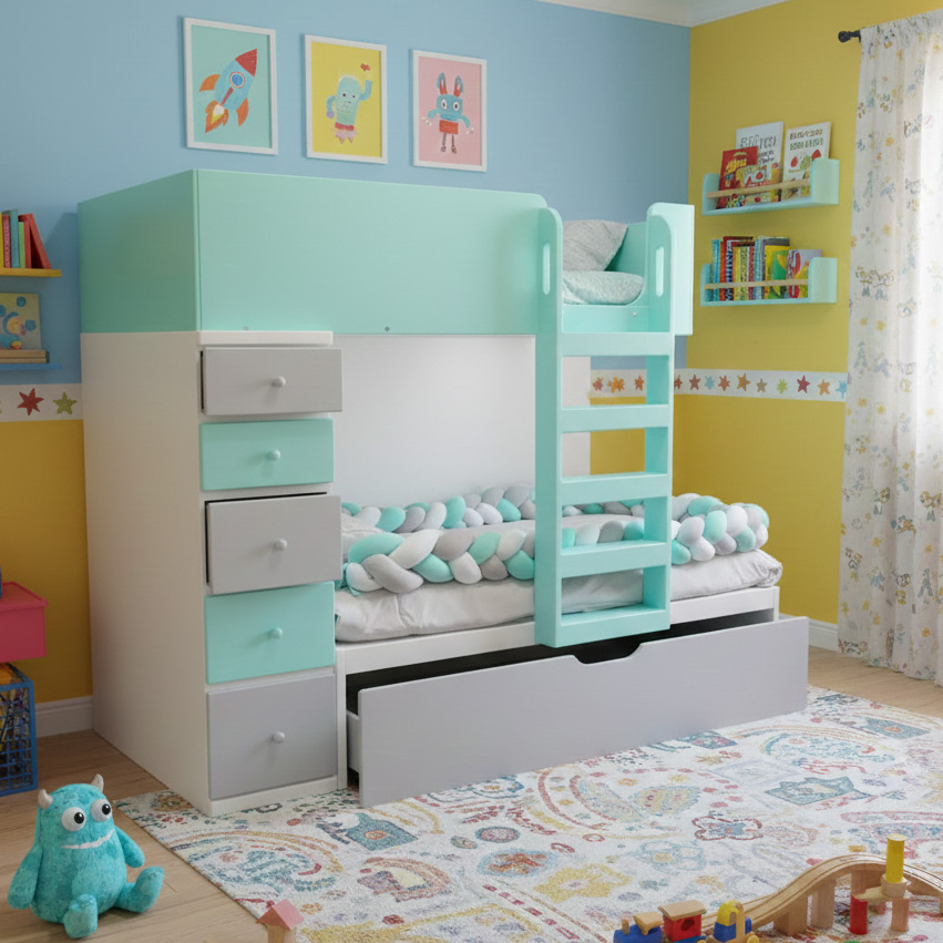 Litera de 3 camas individuales, con cajonera, escalera tipo bombero. Ideal para optimizar el espacio de la recamara de tu Peque, los colores se personalizan.
