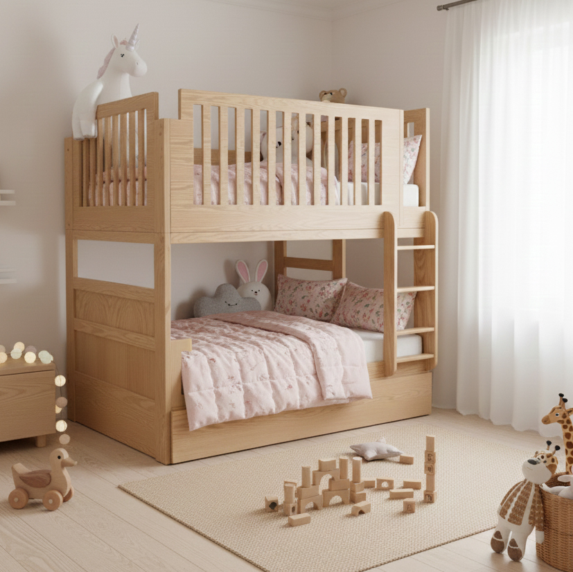 Nuestra Litera Tapanco Encino tamaño individual, con colores naturales es la elección perfecta para los Peques, esta recámara transformará la habitación de tu peque en un lugar lleno de diversión, magia y emoción. Litera 2 camas individuales.