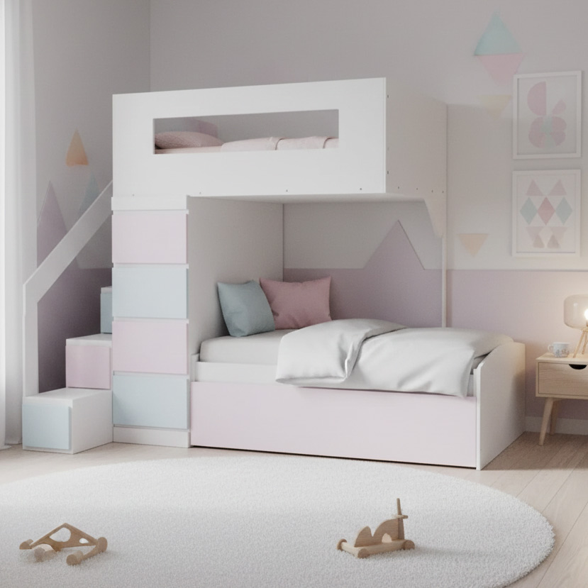 Litera multifuncional cuenta con tres camas y cajonera. $40,900 y escalera cajonera $10,900.