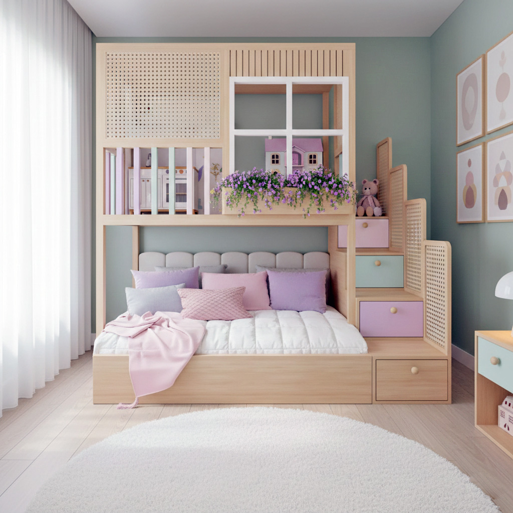 El diseño combina madera y mimbre, incluye una cama baja con cabecera capitonada y una escalera cajonera con barandal de mimbre, asegurando funcionalidad y estilo en cualquier espacio.
