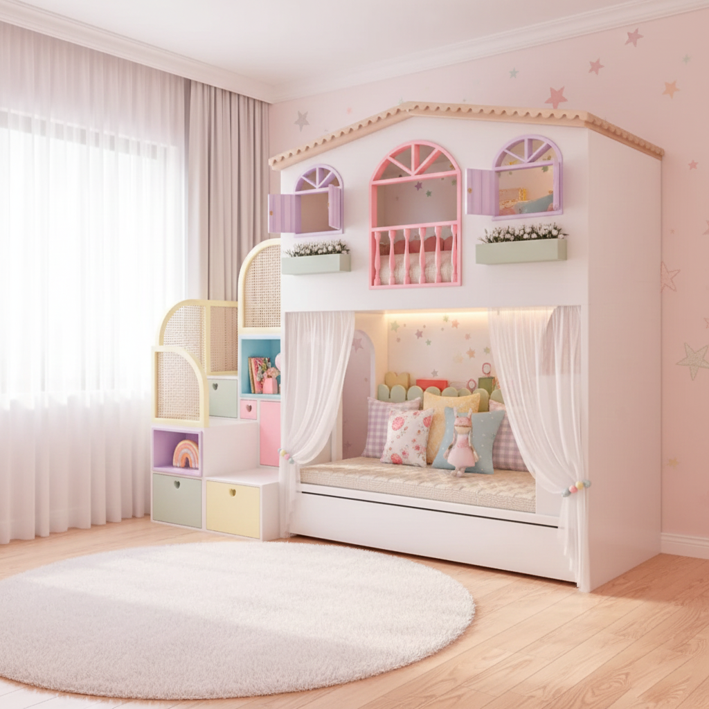 En la parte inferior, cuenta con una cama con capitonado y una cama baja que puede incluir cajones, además de un juguetero en forma de casita para mantener todo en orden. La escalera doble, adornada con detalles en bejuco, proporciona un acceso seguro y cuenta con cajones para almacenamiento adicional. tapanco está iluminado con luces LED en ambas áreas superior e inferior atrás de capitonado, añadiendo un toque mágico al espacio.